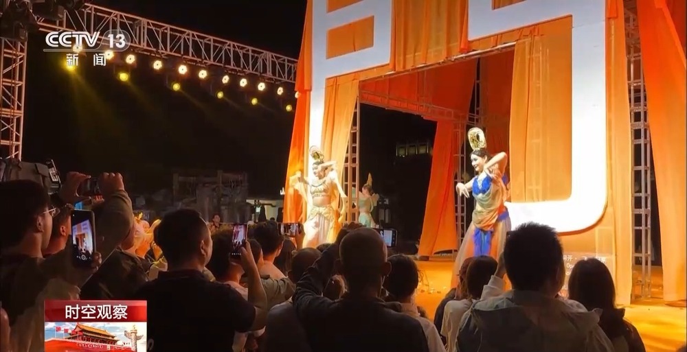 凤凰刚过◈◈,敦煌古乐随即响起◈◈。在天门洞这座天然画框前◈◈,五位“飞天”舞者身着敦煌霓裳登场◈◈,民俗与山水在此刻完美交融◈◈。